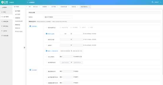 傳統的打標動作,完全依賴員工,批量管理標簽難以實現。艾客的智能打標功能,實現了商家通過客戶的電商信息、互動信息、自定義字段信息作為條件篩選出客戶人群包,并給這批客戶自動打上標簽。