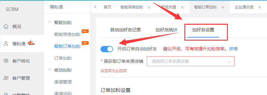 a、進入【爆粉通】-【智能訂單加粉】-【加好友設置】-開啟訂單自動加好友