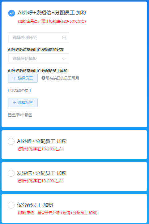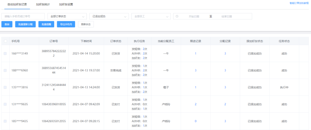 • AI外呼+分配員工加粉:是指有新的訂單收貨手機號時,會導入的手機號進行AI智能外呼,用戶接到電話確定有加好友意向時,接著會將有意向的手機號分配給選中的員工,員工會收到實時提醒,要求員工實時去添加當前這個手機號為好友。