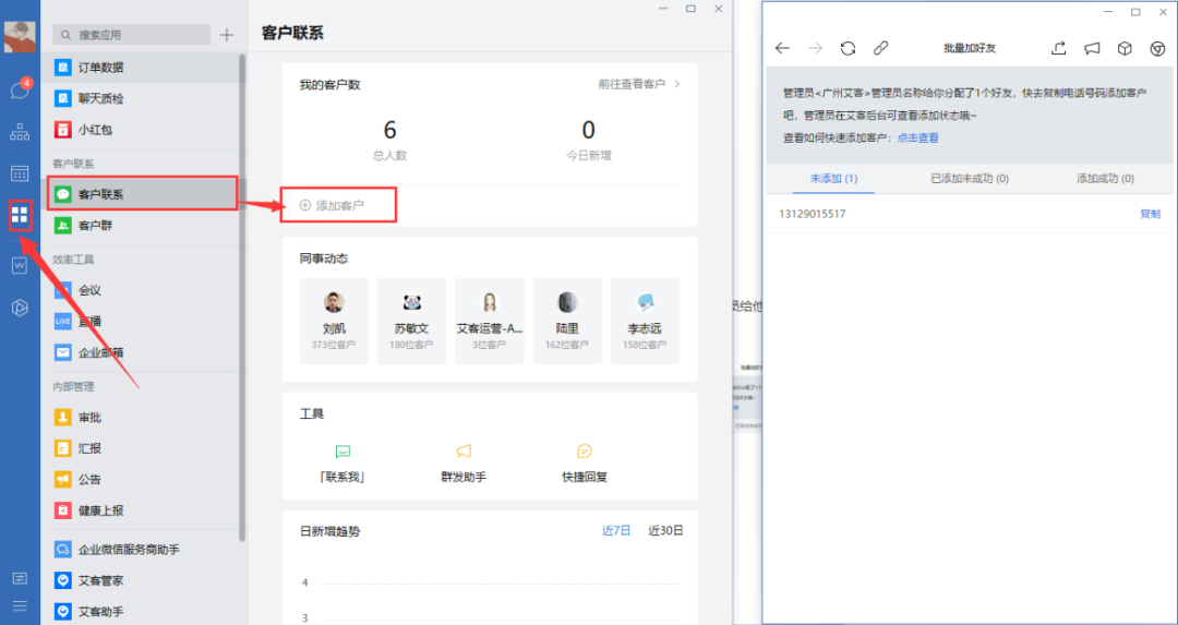在任務時間段內,系統會執行加粉任務,將有意向的手機號通過 “艾客助手” 通知選中的員工。