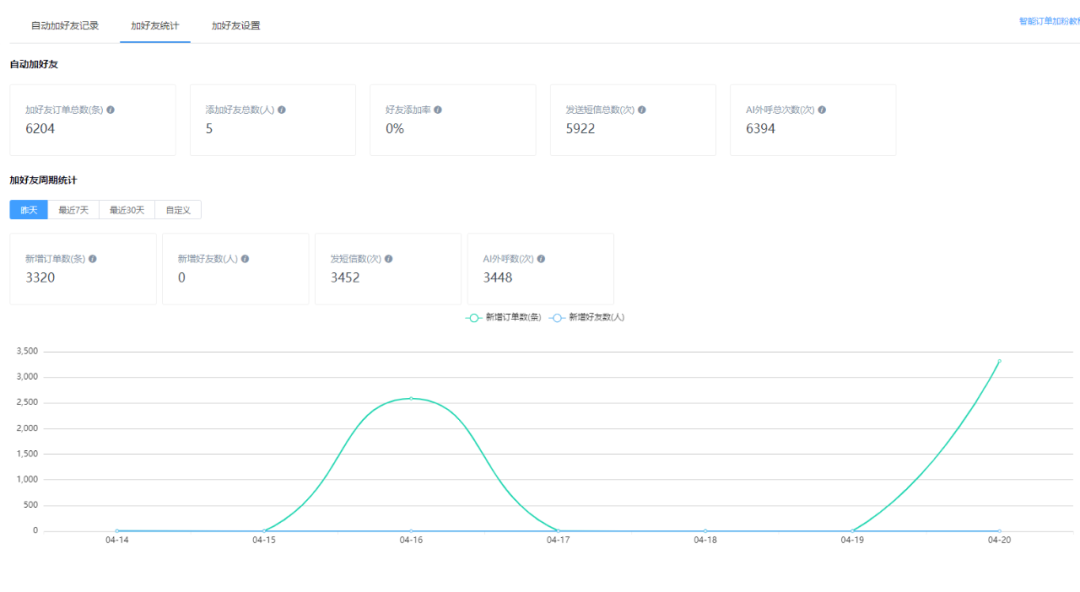 智能訂單加粉是指打通各大電商平臺(淘系、京東、有贊、抖店、微盟....),當商家在這些電商平臺的店鋪有新訂單時候,會自動獲取訂單中的收貨手機號,并對手機號批量進行AI智能外呼,當用戶有加好友意向時,會將對手機號發送確認短信,并將手機號分配給員工實時去添加。