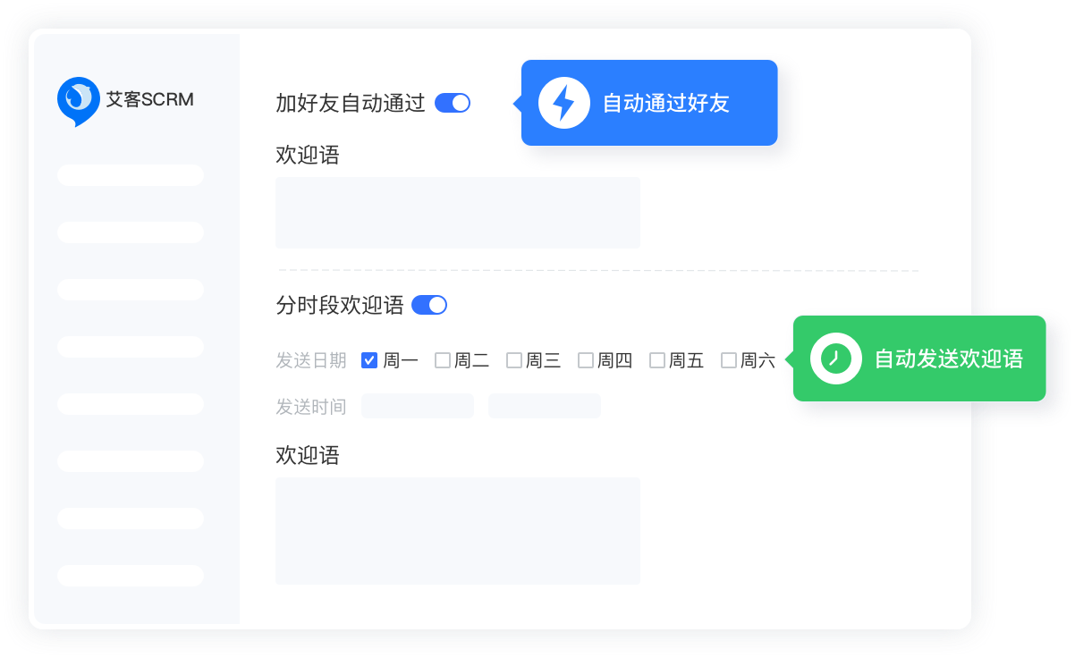 客戶添加可設(shè)置時(shí)間自動(dòng)通過(guò),同時(shí)客戶自定義個(gè)人歡迎語(yǔ)和群歡迎語(yǔ),讓接待客戶的開始時(shí)刻就讓客戶感受到溫暖