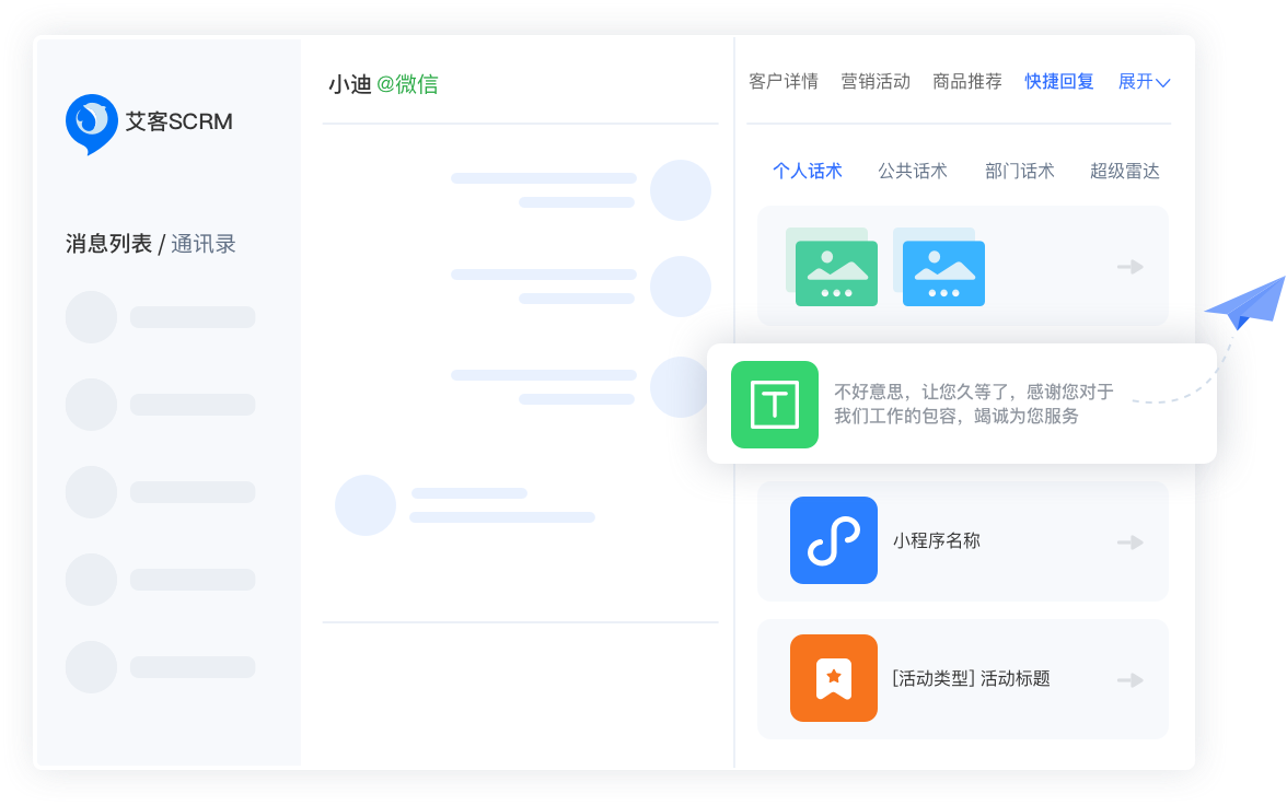 企微聊天側(cè)邊欄可以預(yù)設(shè)聊天個(gè)人話術(shù)客戶,企業(yè)素材庫(kù),支持格文字/圖片/視頻/文件/鏈接/小程序/視頻號(hào)等多種格式