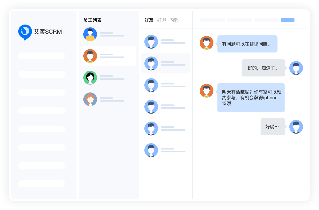 實(shí)時(shí)查看員工聊天記錄;云端自動(dòng)保存;支持關(guān)鍵詞搜索,聊天導(dǎo)出;支持按照銷售查看會(huì)話,按照客戶查看會(huì)話