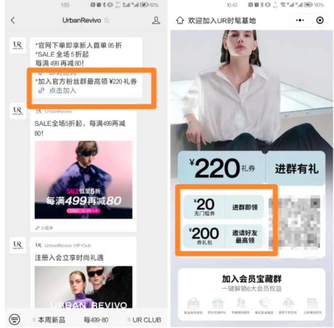 新用戶關(guān)注公眾號【UrbanRevivo】即收到自動歡迎語,針對新用戶推出新人首單95折優(yōu)惠,利用折扣福利,如無門檻20元優(yōu)惠券等吸引用戶加入官方福利社群