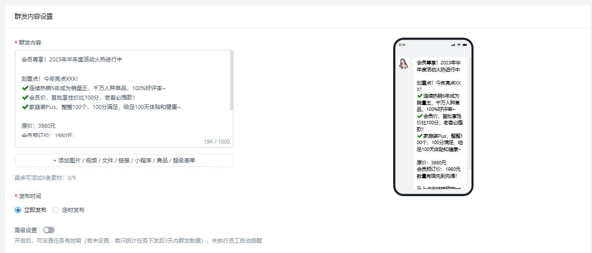 客戶群發(fā):做精準化營銷的關(guān)鍵在于了解客戶的需求,我們可以通過精細化的標簽實現(xiàn)千人千面,不同客戶推送定制化的內(nèi)容,同時也可以選擇排除標簽,群發(fā)內(nèi)容可以選擇圖片,文本,視頻,鏈接等,也可以實現(xiàn)立即發(fā)送或者定時發(fā)送
