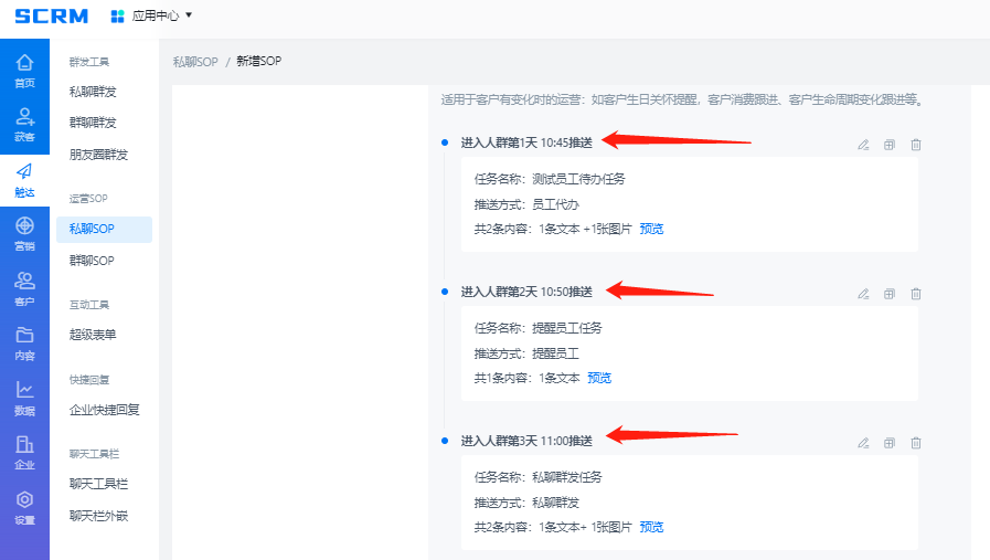 內(nèi)容傳播是營銷的必要要素,我們想讓客戶產(chǎn)生復(fù)購,一定需要先把各項活動、優(yōu)惠、福利信息通知到客戶或者各大社群。營銷內(nèi)容可以通過這四個功能進行觸達:客戶SOP、朋友圈、客戶群發(fā)、客戶群群發(fā)。