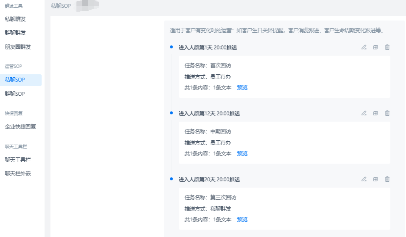 激活沉默用戶可以采用主動喚醒和被動喚醒的方式,但被動喚醒需要促使用戶產(chǎn)生使用需求,然后用戶自動聯(lián)想到產(chǎn)品,這種方式更適合有知名度的產(chǎn)品或企業(yè),否則具有一定的難度。因此企業(yè)激活沉默用戶可以采用主動喚醒的方式,想方設(shè)法將消息觸達(dá)到客戶,達(dá)到讓客戶有再次使用產(chǎn)品的期望,刺激客戶再次購買的欲望。喚醒沉默用戶的關(guān)鍵點(diǎn)在于要把內(nèi)容精準(zhǔn)推送給客戶,也就是有效聯(lián)系到客戶,否則會給客戶造成騷擾,直接激活失敗。傳統(tǒng)的用戶激活方式,比如:手機(jī)短信、電話營銷等方法已無法滿足企業(yè)激活用戶的需求,企業(yè)可以采用私域觸達(dá)來激活客戶,比如艾客SCRM的私聊SOP,有效觸達(dá)到沉默用戶。