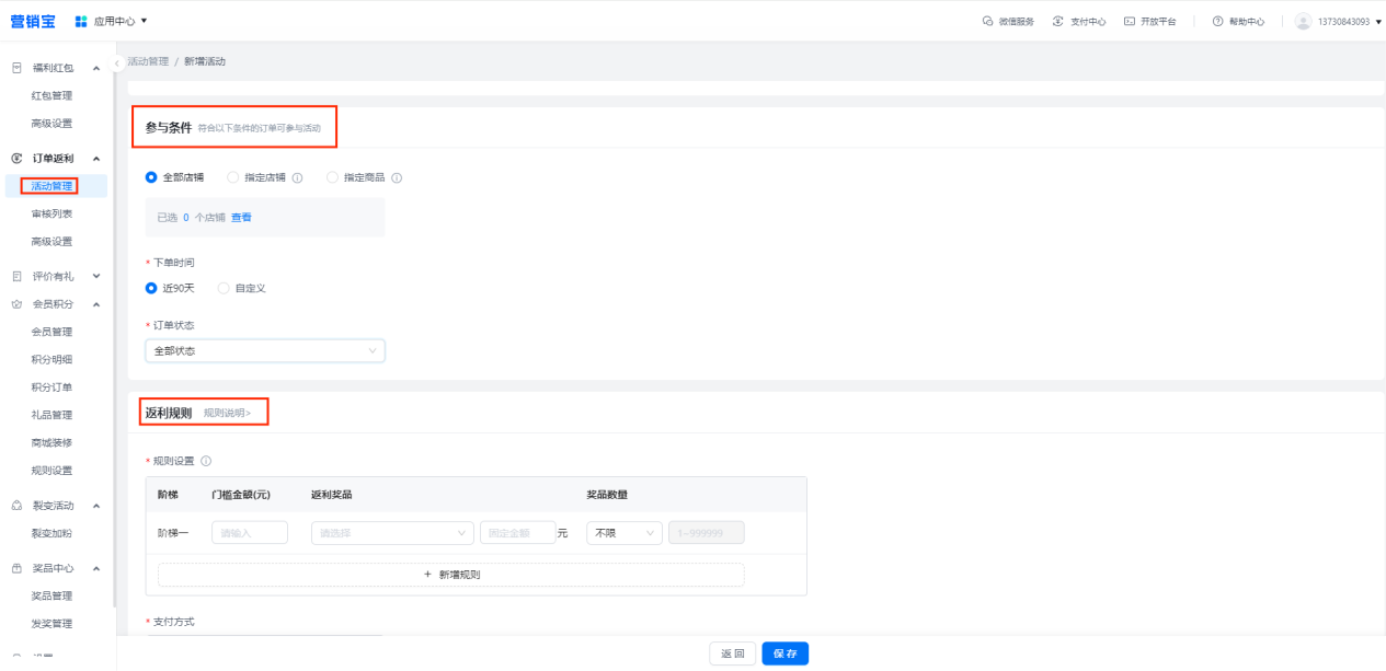 根據訂單活動訂單的指定店鋪、全部店鋪或指定商品,其中訂單狀態課設置為待發貨、待收貨、交易完成多種方式,設置訂單返利梯度門檻等