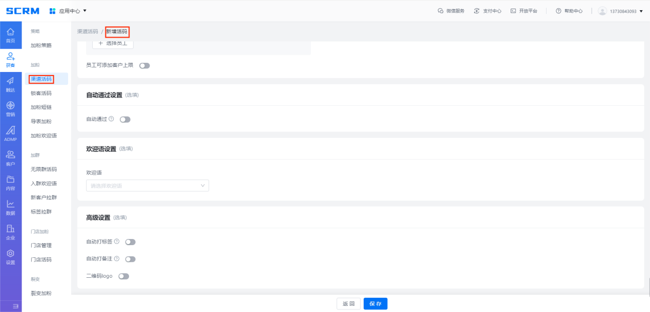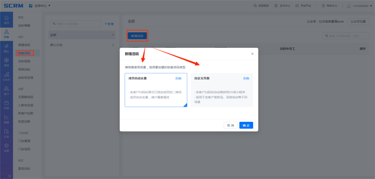 圖1:工具路徑:艾客SCRM-獲客-渠道活碼-新增活碼