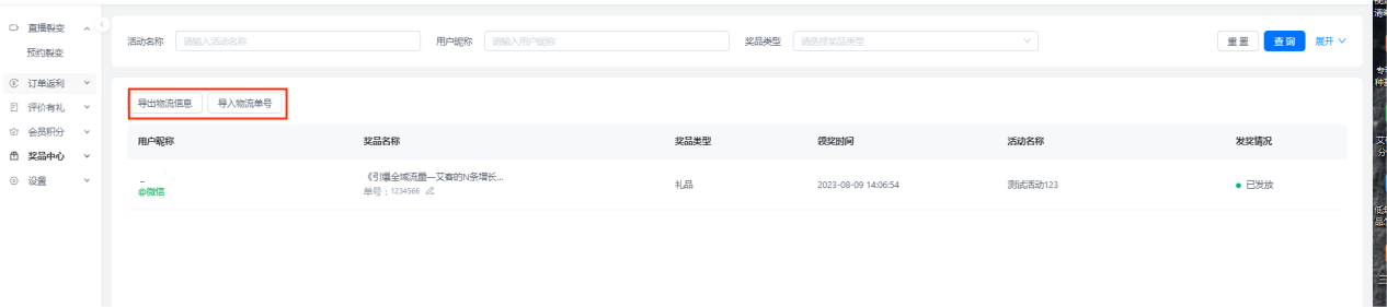 達標用戶填寫收獲信息,商家在艾客后臺可一鍵獲取地址信息,發貨后導入物流單號。