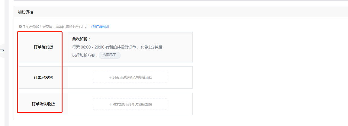企業加好友的訂單狀態有三種:代發貨、已發貨、確認收貨,企業可以開啟一種或者多種狀態下去加好友。當某個狀態加好友成功之后,系統會自動終結下一階段的加好友任務。當加粉成功后,系統自動給客戶打上對應標簽。在加好友設置過程中,企業可以設置執行加粉的時間段、分配加粉員工。