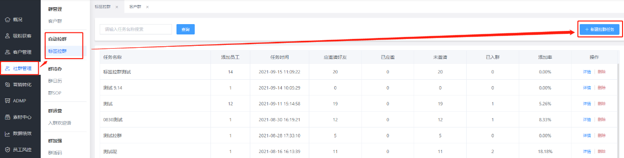 ①新建任務(wù),點(diǎn)擊右上角[新建拉群任務(wù)]即可創(chuàng)建新任務(wù)