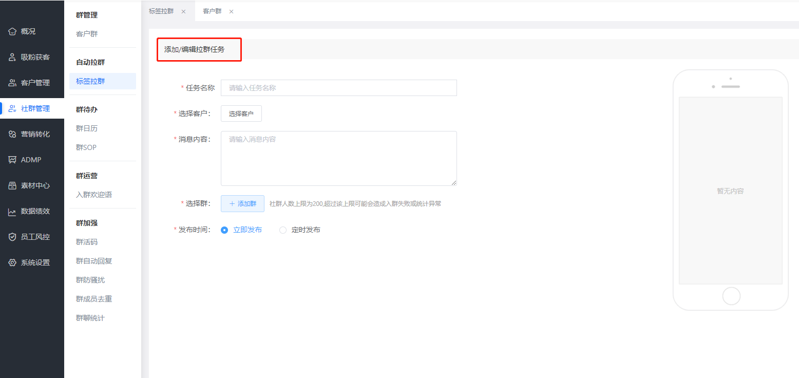 ②按標(biāo)簽選定需入群的客戶,指定需加入的群并上傳群二維碼,添加適當(dāng)?shù)娜肴貉?qǐng)語,即可生成一條拉群任務(wù)