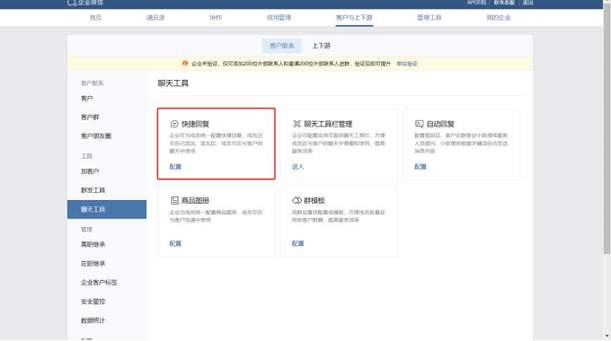 那么問題來了,企業(yè)微信如何創(chuàng)建快捷回復(fù)?其實企業(yè)微信快捷回復(fù)的創(chuàng)建方法很簡單,管理員進(jìn)入企業(yè)微信后臺,在【客戶與上下游】—【客戶聯(lián)系】—【聊天工具】中,就可以配置快捷回復(fù)。