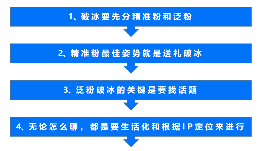 破冰就是與用戶開啟私聊,建立信任鏈接用戶,而面對精準粉用戶和泛粉用戶需要采取不同的策略。面對精準粉的切入點最優方案是結合利益點吸粉之后的跟進,因此在強調產品和服務之外,一定的增值項目是塑造良好的第一印象的要點。協助兌獎、跟進物流、買家秀邀請和禮品回訪等都是后續與用戶保持良好聯系的極佳契機。而面對泛粉,吸引他們的回復相對困難,可根據用戶擅長和關注的領域開啟話題,其次制造不小心撤回信息或發出店面活動福利都可以引起注意。
