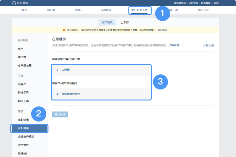 而在管理端操作則是:企業(yè)微信管理員登錄企業(yè)微信后臺,在“客戶與上下游”——“客戶聯(lián)系”——“在職繼承”,就可以使用在職繼承功能把需要轉移的客戶或者客戶群分配給其他在職員工了。