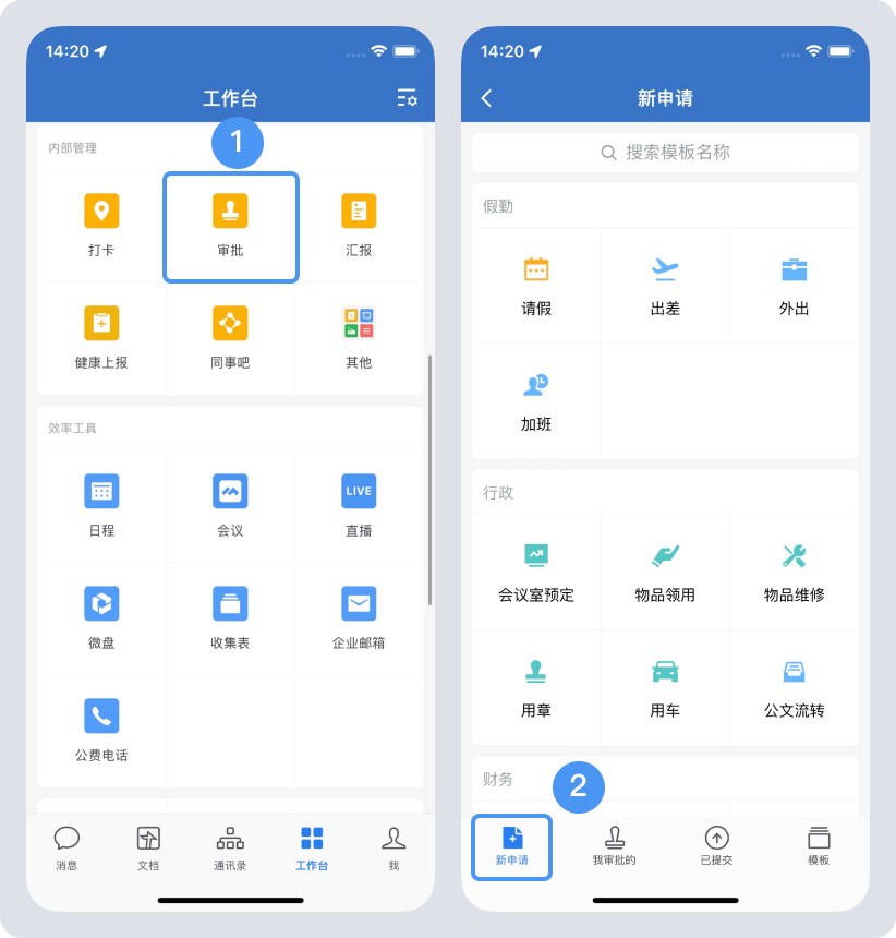 手機(jī)端:在“工作臺”——“審批”——“新申請”