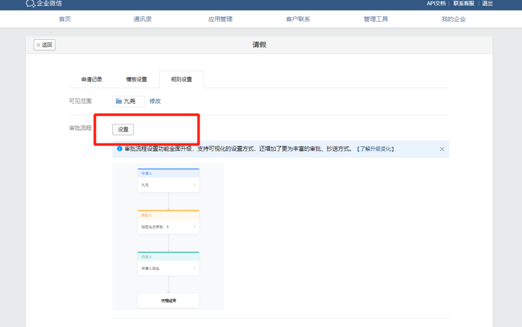 企業(yè)微信管理者進(jìn)入企業(yè)微信管理后臺,在“應(yīng)用管理”——“審批”——“設(shè)置”,設(shè)置好相對應(yīng)的規(guī)則,規(guī)則里可以設(shè)置固定的審批人以及抄送人。