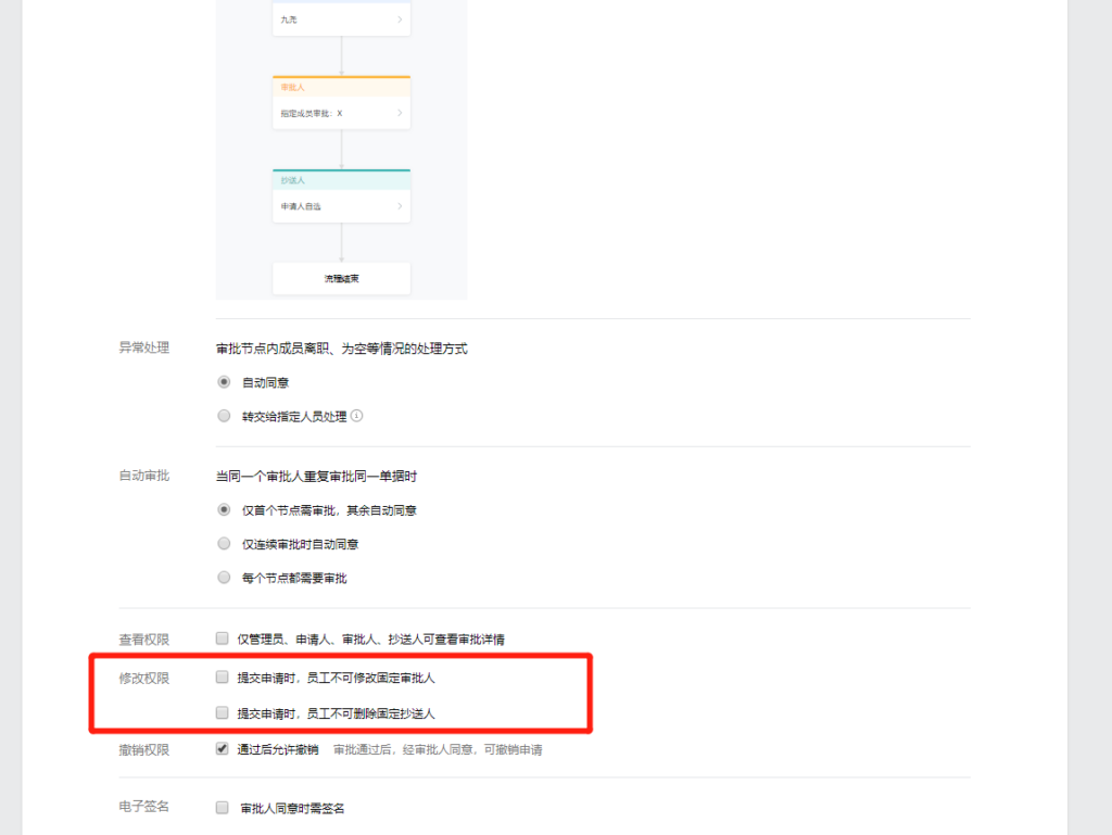 對異常處理、自動審批、查看權(quán)限、修改權(quán)限、撤銷權(quán)限、電子簽名方面都有對應(yīng)的選擇,企業(yè)可根據(jù)自身情況進(jìn)行選擇即可。