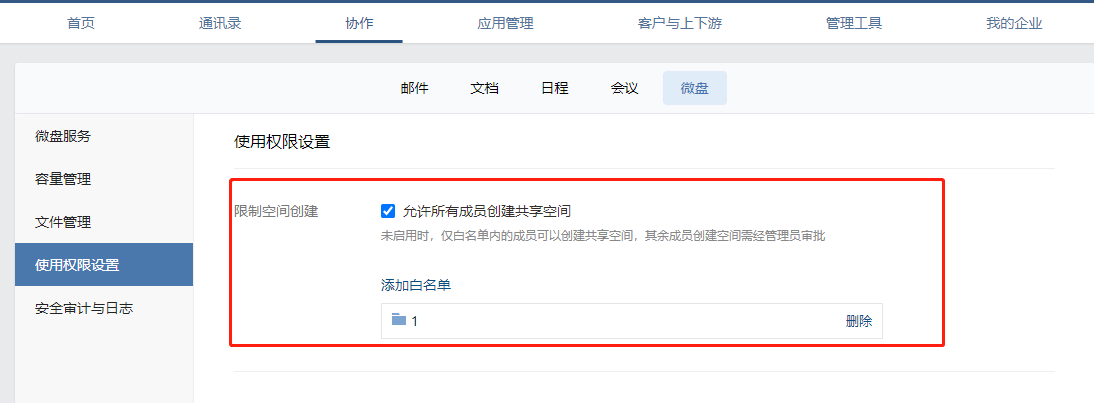 企業微信管理員可以給分級管理員添加微盤的管理權限,也可以限制成員使用量,對空間創建也可以進行限制,還可以限制空間人數。