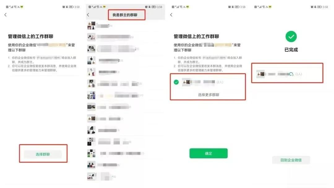 首先普通微信群是支持一鍵轉企業微信群的,具體怎么操作呢?先打開企業微信,在【接收】里找到【打開微信中的工作消息】,然后點擊【去微信選擇更多工作社群】。待跳轉到微信,點擊【選擇群聊】,選擇一個或是多個社群,最后點擊【確認】即可將微信群轉為企業微信群。