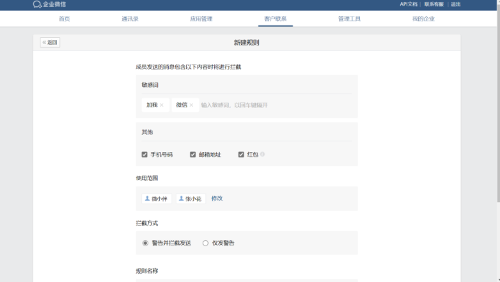 企業(yè)微信敏感詞攔截設(shè)置起來(lái)很簡(jiǎn)單,只需要管理員登錄企業(yè)微信后臺(tái),在【客戶聯(lián)系】—【安全管控】中即可配置規(guī)則適用的員工或客戶,這樣能攔截“加微信”等常見(jiàn)敏感表述,還可以阻止員工發(fā)送手機(jī)號(hào)、紅包等違規(guī)內(nèi)容。