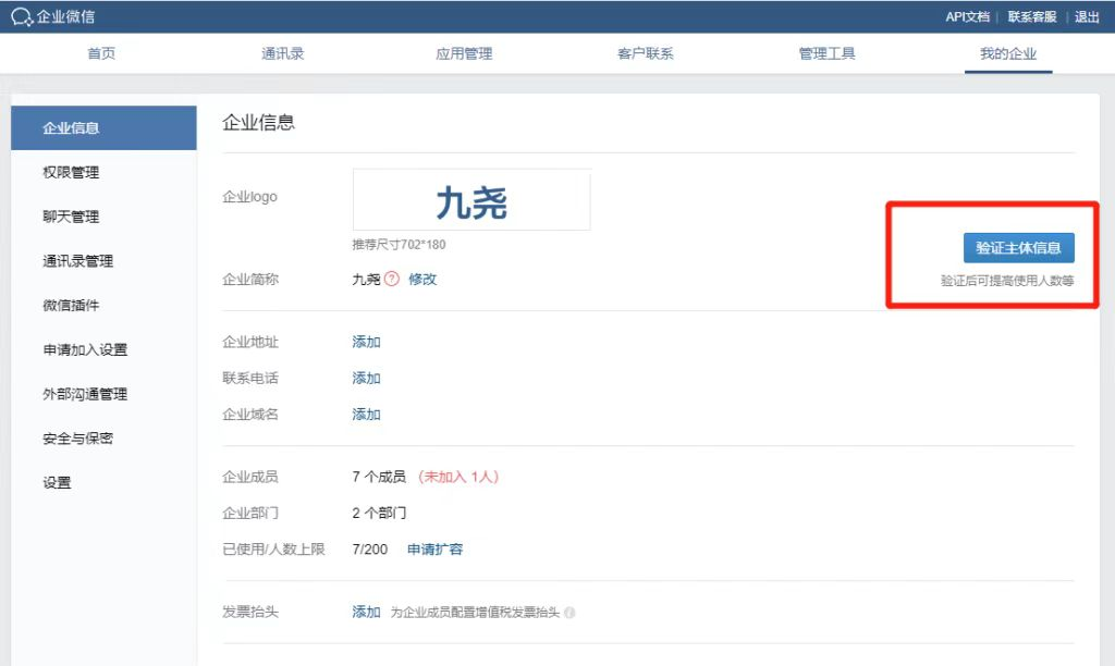 另外能由管理員進入手機企業微信,按路徑【工作臺】—【管理企業】—【企業信息】點擊進行驗證,完成綁定。