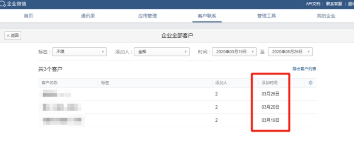 管理員進入企業(yè)微信后臺能輕松查看客戶信息,在【客戶聯(lián)系】中點擊【客戶】按鈕,就能在“查看客戶列表”中瀏覽企業(yè)全部客戶數(shù)據(jù)。如果需要針對特定客戶進行查詢,能夠通過添加員工、時間范圍、客戶標簽等條件進行篩選。