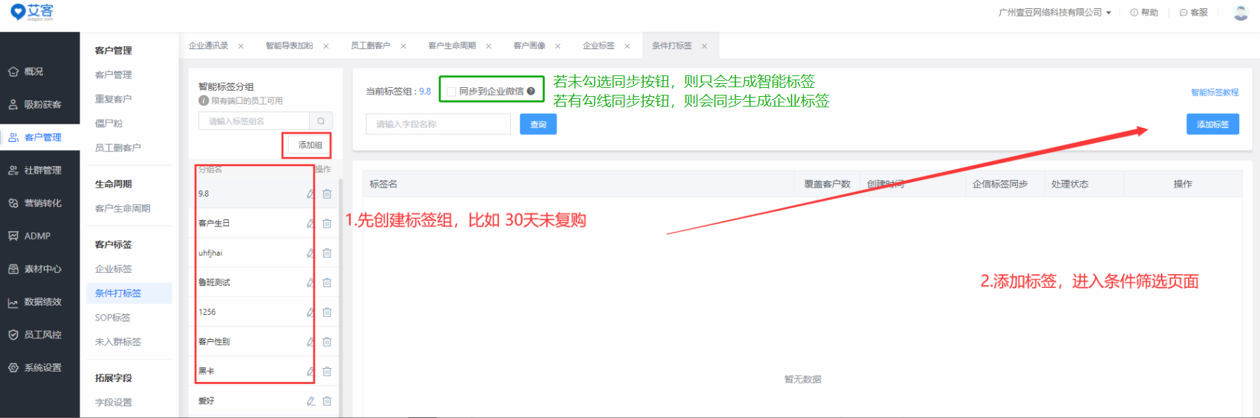 艾客的條件打標簽功能,支持企業通過不同的條件進行篩選,給客戶自動打上標簽。這些僵尸粉可以通過條件打標簽篩選出來,再統一進行批量刪除。