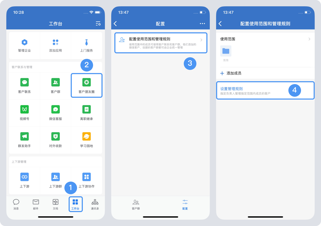 3、手機端:手機登錄企業微信,在“工作臺”——“客戶朋友圈”——“配置”——“配置使用范圍和管理規則”,這個選項的入口給企業成員添加朋友圈的使用權限即可。