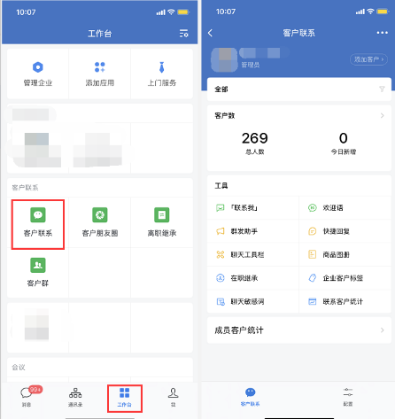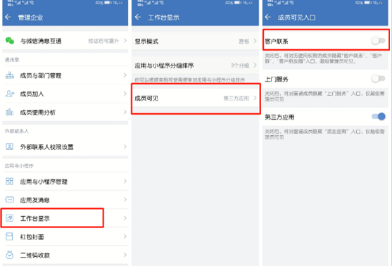 對使用企微營銷的用戶來說,客戶聯(lián)系功能十分重要,可以幫助企業(yè)了解客戶增長情況,提高運營效率。而企業(yè)微信不顯示客戶聯(lián)系功能的原因無非是企業(yè)管理員沒給成員使用客戶聯(lián)系功能的權(quán)限,在手機端企業(yè)微信的【工作臺】—【管理企業(yè)】頁面可以看到【工作臺顯示】按鈕,點擊后進(jìn)入【成員可見】入口,可以看到客戶聯(lián)系按鈕關(guān)閉。