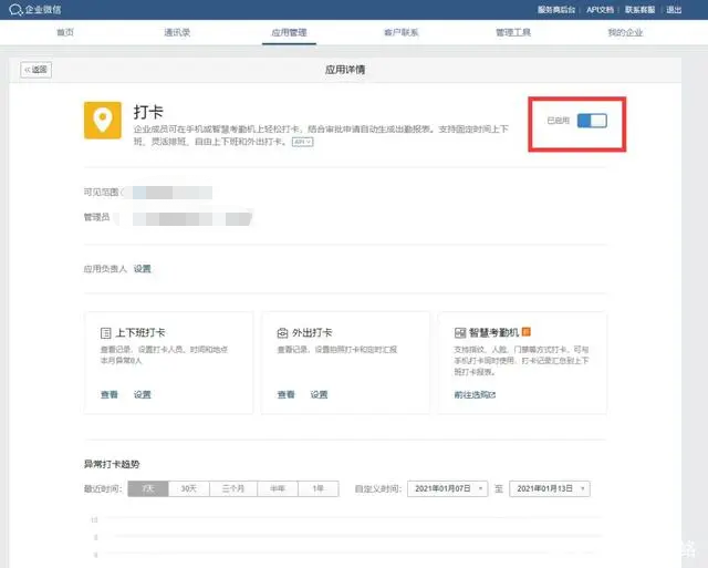 企業(yè)想要使用企業(yè)微信的打卡功能,需要企業(yè)微信管理員先在企業(yè)微信管理后臺(tái)把打卡功能打開(kāi)。打開(kāi)步驟如下: