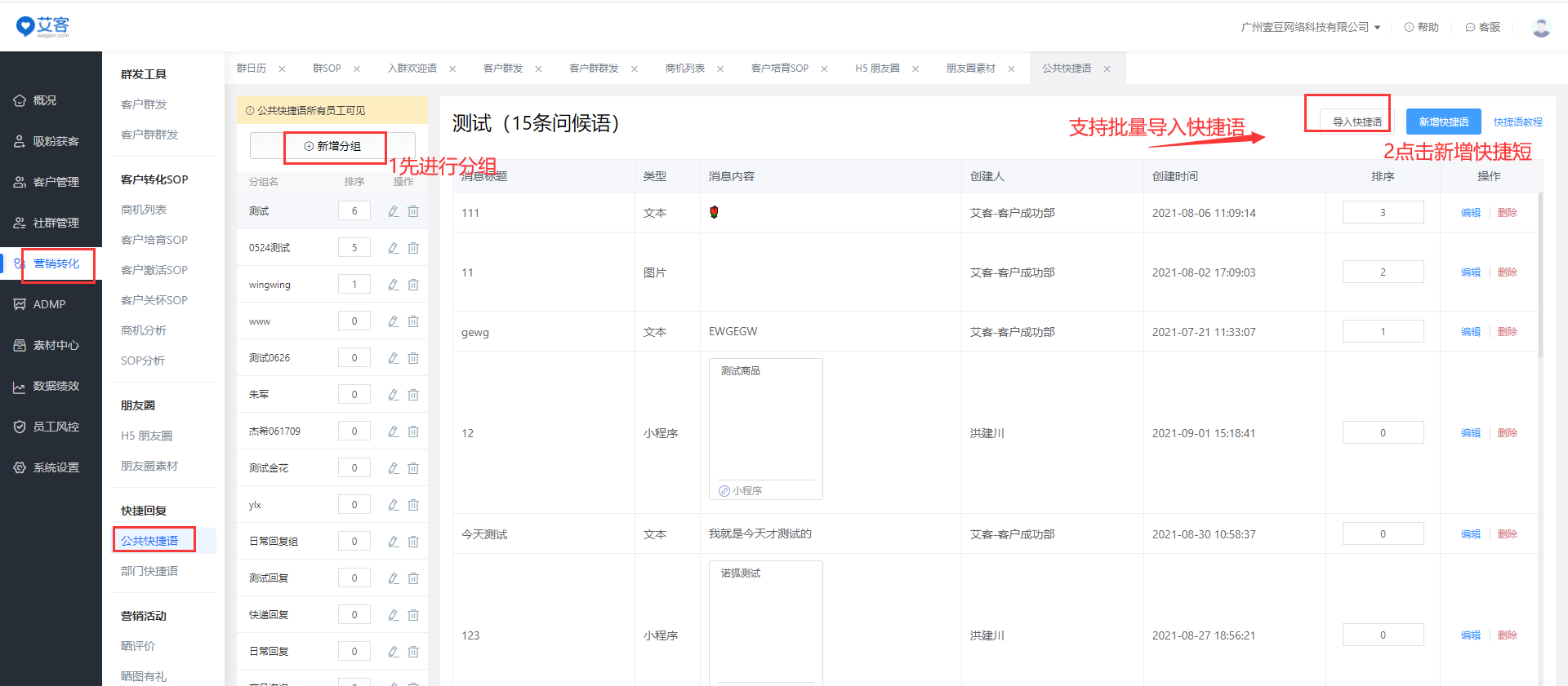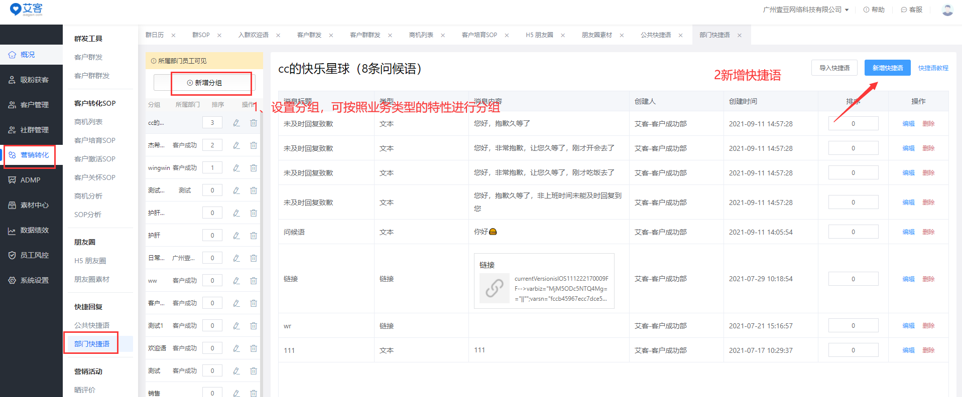企業如果想要在快捷回復方面有更加豐富的內容形式,可以使用艾客SCRM系統的快捷回復功能,分別可以配置公共快捷語和部門快捷語,支持文本、圖片、視頻、鏈接、文件形式,讓員工能更加快速回復客戶問題,提升溝通效率。