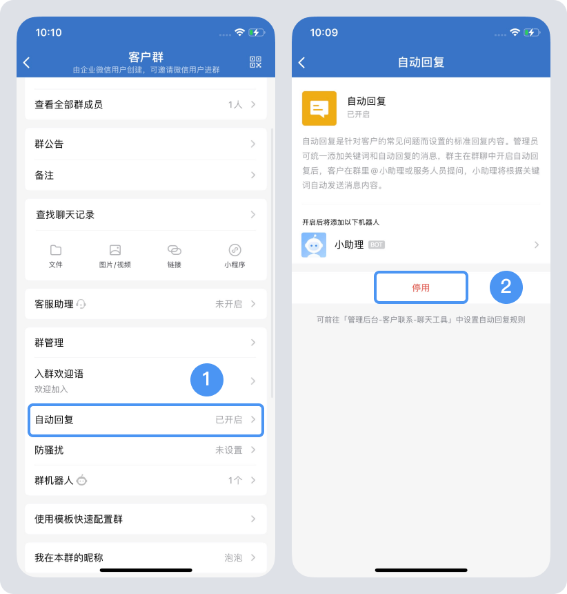 當客戶群群主想要關閉客戶群的自動回復功能時,只需要再進入客戶群內的自動回復設置頁面,點擊“停用”即可。