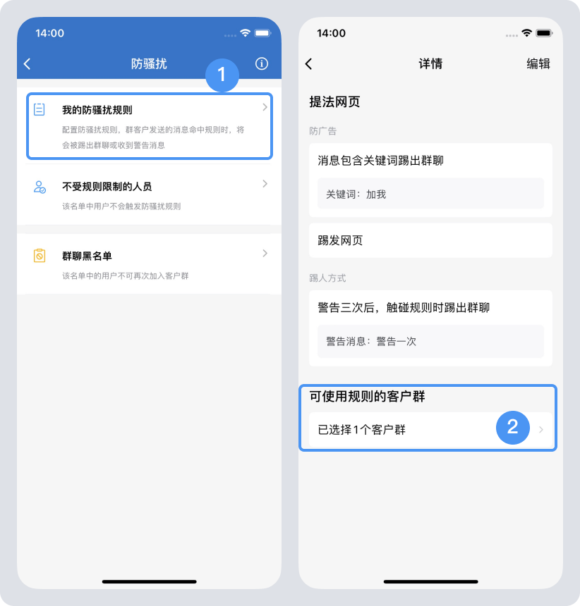 登錄手機端企業微信,在“工作臺”——“客戶群”——“防騷擾”——“我的防騷擾規則”中進行配置,然后選擇使用的客戶群,在這些被選擇使用的客戶群的群資料中,開啟防騷擾功能。一個客戶群可以支持設置多條防騷擾規則,可以放心進行配置。