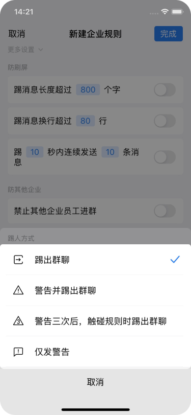 四種提示分別為:1、踢出群聊,2、警告并踢出群聊,3、警告三次后,觸碰規則時踢出群聊,4、僅發警告。這四種選擇企業可以根據此條規則的相關內容重要度進行設置。