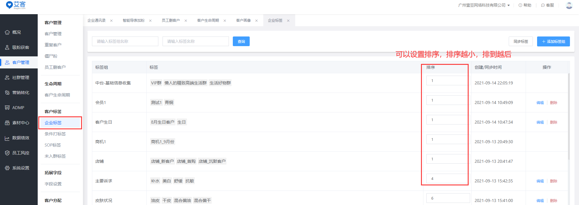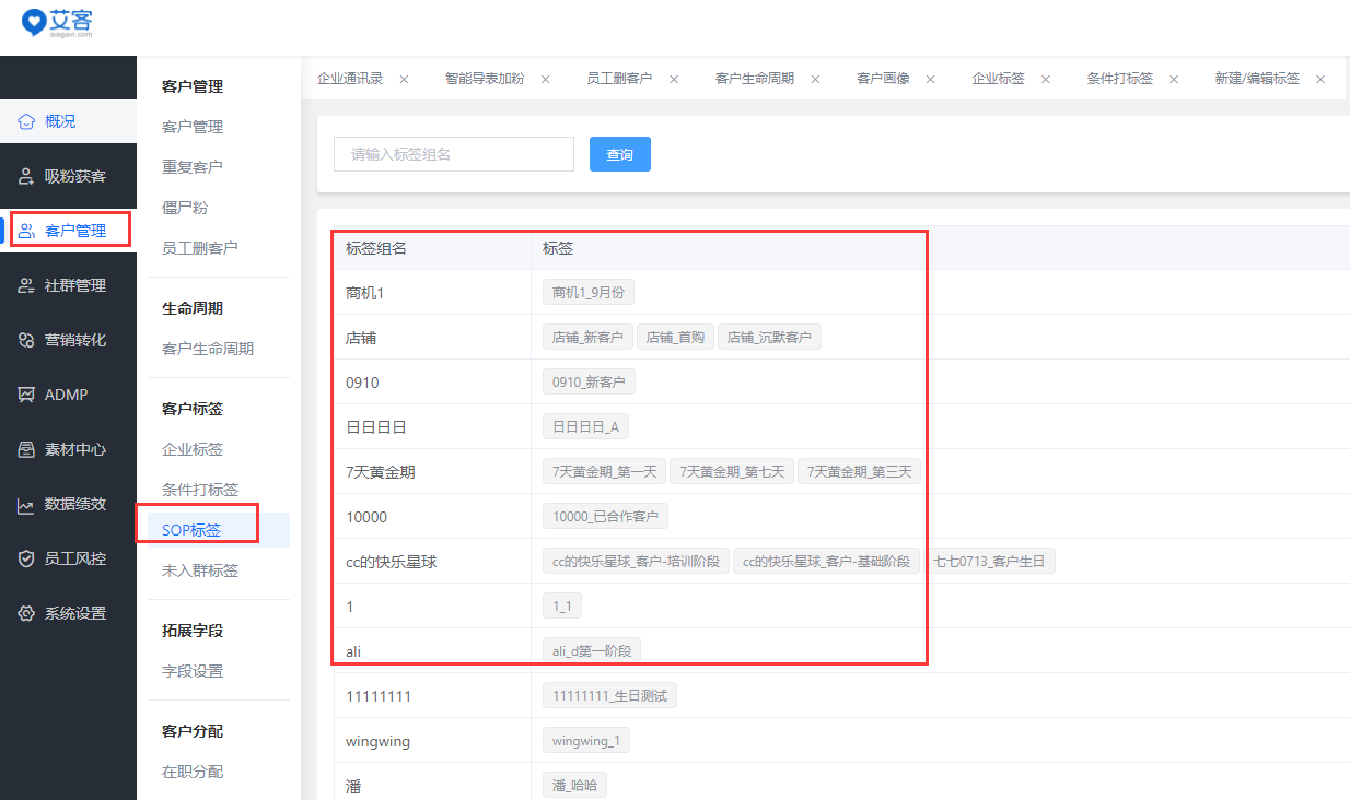 企業可以把企業微信的企業標簽同步到艾客系統后臺,方便在管理端進行對企業標簽的增加、刪除、和修改。