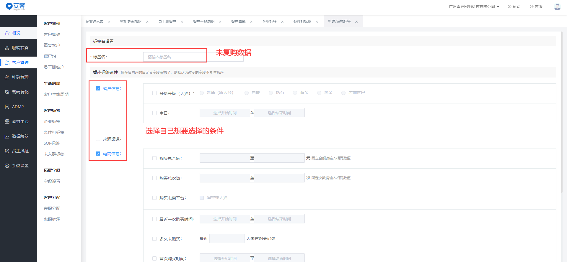 企業可以通過客戶電商信息、互動信息、自定義字段信息等作為條件篩選出精準客戶人群,并給這批客戶自動打上標簽。