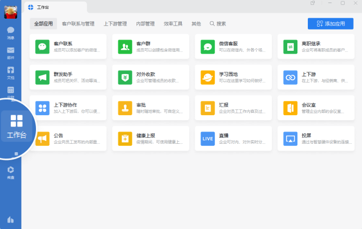 企業如果把常用的程序添加至工作臺內,那么當使用時就不用進行搜索,直接點擊使用即可,比較方便。怎樣往工作臺中添加應用呢?