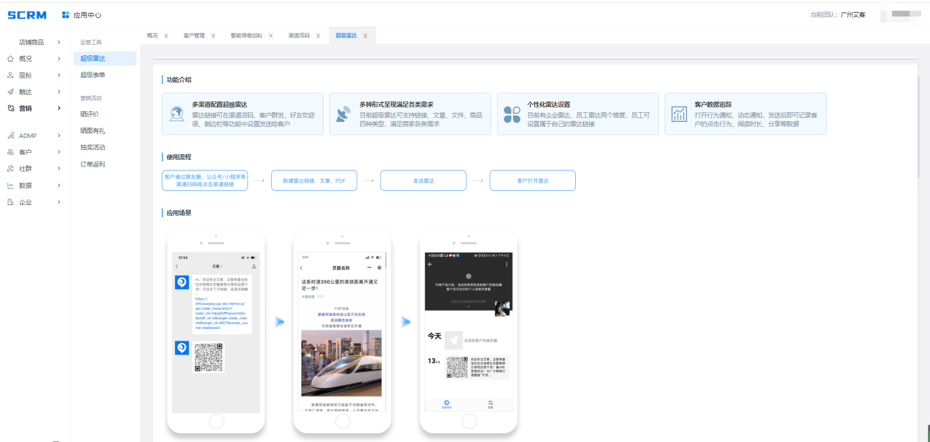 但是,對于外部的客戶,企業(yè)微信目前不支持查看客戶是否已讀我們的發(fā)送的消息,如果想要知道客戶是否已讀我們發(fā)送的活動內(nèi)容、產(chǎn)品信息等等,可以借助企業(yè)微信服務(wù)商——艾客SCRM的【超級雷達(dá)】功能。