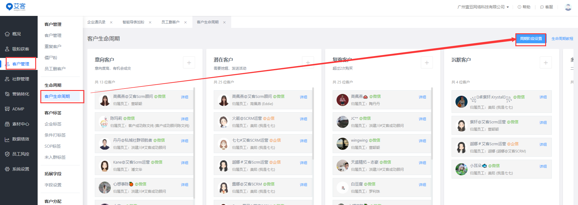 使用艾客的【客戶生命周期】功能,它能牢牢把握住客戶從加企業微信好友開始到流失所處的各個發展階段。并且在客戶管理功能中,還能查看各個客戶周期階段的分布記錄以及查看與客戶的聊天記錄。企業可以清晰了解哪些是沉睡客戶。