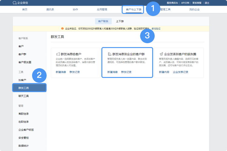企業微信管理后臺:“客戶與上下游”——“群發工具”——“群發消息到企業的客戶群”。