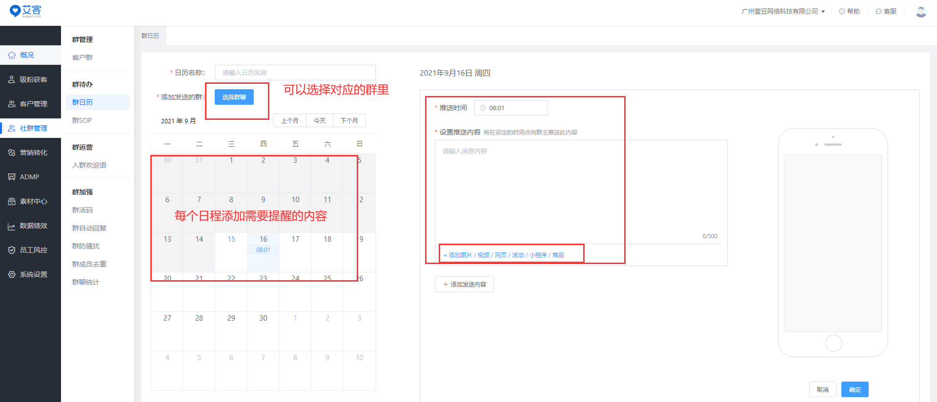 還可以搭配群日歷功能一起使用,群日歷功能是達到指定時間后通知對應的員工去執行對應的任務,它能讓群SOP推送時間更加精準,企業可以對所推送的內容具有一個清晰的時間線認知。