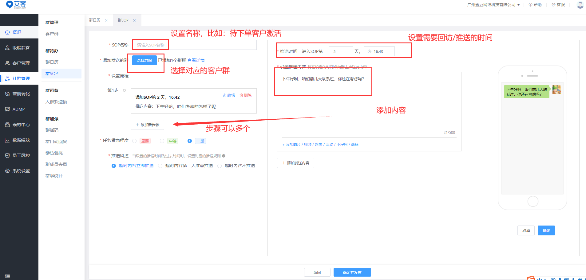 關于群消息的發(fā)布,企業(yè)還可以利用艾客SCRM的群日歷和群SOP功能。群日歷可以給對應群添加日歷任務,到達指定時間后通知對應的員工去執(zhí)行對應的任務。幫助商家更高效的管理和運營用戶群。群SOP是給群制定sop線性任務,達到條件后通知員工去執(zhí)行不同的任務,將群運營流程化,幫助商家更好的提升群的轉(zhuǎn)化。