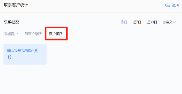 需要注意的是,這里客戶流失數(shù)據(jù)包括刪除/拉黑成員的客戶數(shù),而且一個(gè)客戶在一個(gè)自然內(nèi)對(duì)成員有多次刪除拉黑的操作,也只記錄一次。