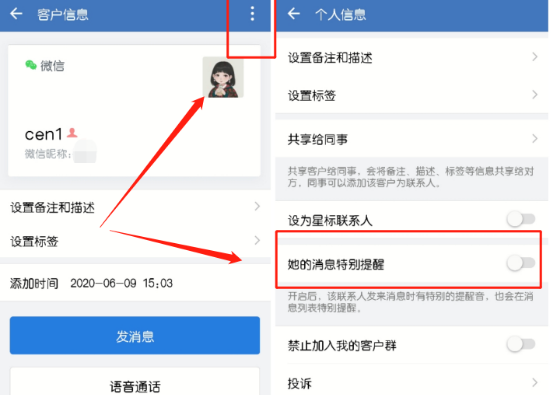 第二種方法是點擊需設置特別提醒的客戶頭像,點擊進入消息頁面,然后點擊頁面右上方的三個點,進入后就可以開啟她的消息特別提醒。