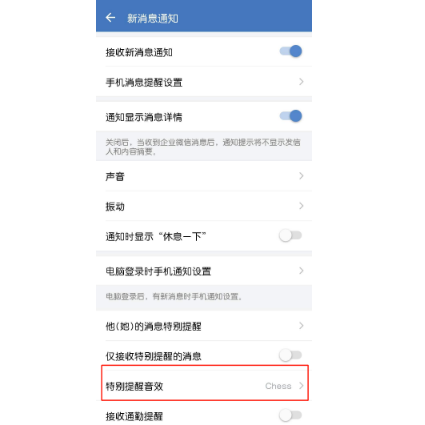在企業微信中不僅可以給聯系人設置特別提醒,還可以設置特別提示音,通過路徑【我】—【設置】—【新消息通知】,就能看到一個“特別提醒音效”的選項,可以自己選擇關閉音效。