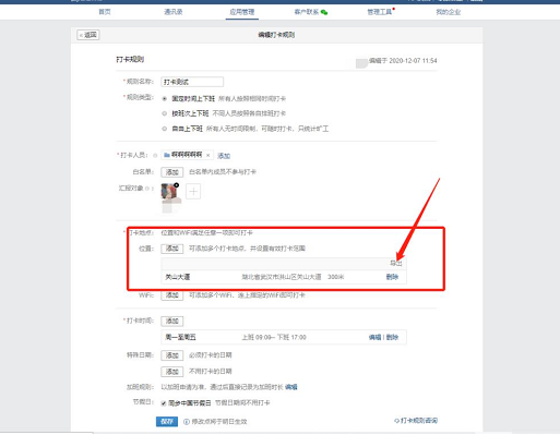 若是因?yàn)楣景徇w等原因,需要修改定位,管理員可以登錄企微管理后臺(tái)進(jìn)行操作。通過(guò)路徑【應(yīng)用管理】—【打卡】編輯原先設(shè)置好的打卡規(guī)則,刪除之前的打卡地點(diǎn),然后添加新打卡地點(diǎn)就可以。