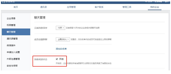 1、管理員登錄企業(yè)微信管理后臺,在【我的企業(yè)】—【聊天管理】—【消息閱讀狀態(tài)】中開啟“已讀”功能即可。